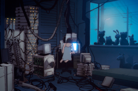 En la serie, la tecnología no aparece como herramienta externa. Está integrada en la vida cotidiana y en la percepción. Conforme Lain se relaciona más con la red, su habitación se transforma: las computadoras se multiplican, ocupan paredes, vibran, iluminan. El espacio doméstico se convierte en extensión del sí-mismo.